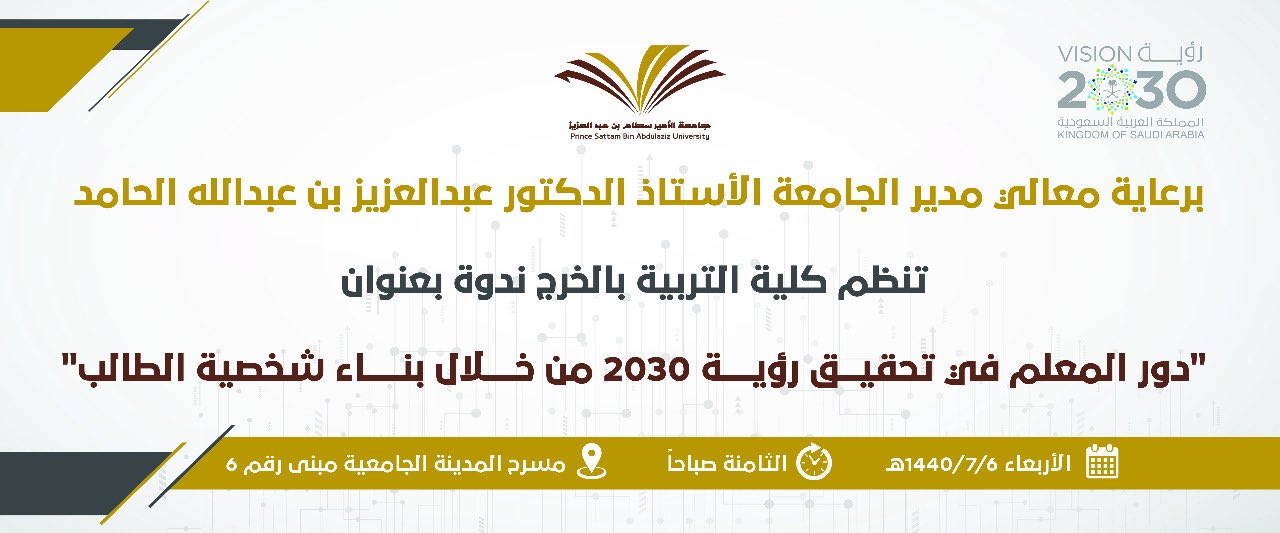 جامعة الأمير سط ام On Twitter ندوة بعنوان دور المعلم في تحقيق رؤية المملكة 2030 من خلال بناء شخصية الطالب في كلية التربية بالخرج يوم الأربعاء القادم ٦ ٧