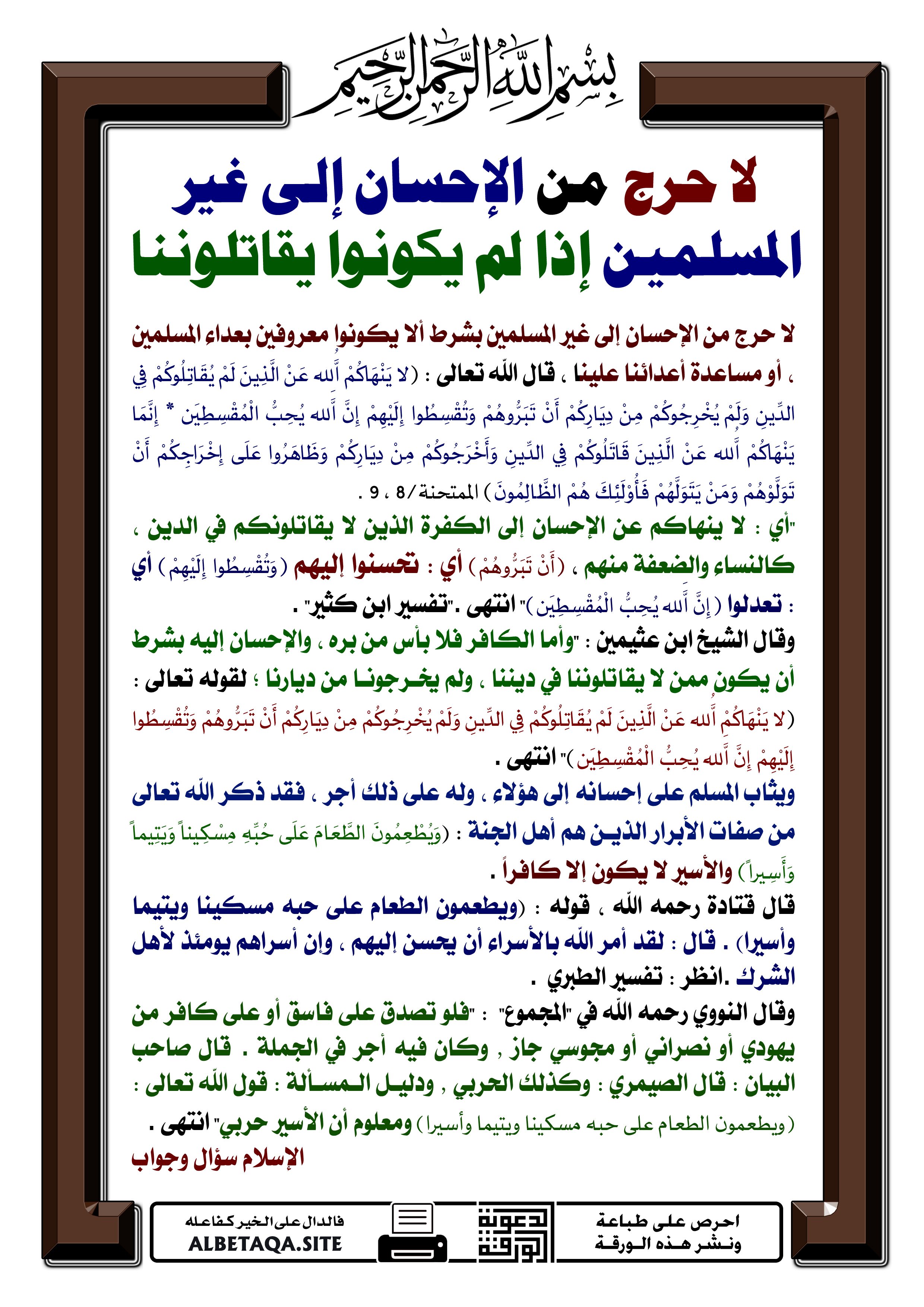 لا حرج من الإحسان إلى غير المسلمين إذا لم يكونوا يقاتلوننا موقع البطاقة الدعوي
