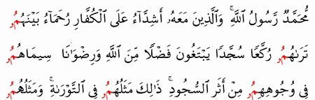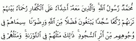 م ح م د ر س ول الل ه و ال ذ ين م ع ه أ ش د اء ع ل ى ال ك ف ار ر ح م اء ب ي ن ه م ت ر اه م ر ك ع ا س ج د ا ي ب ت غ ون ف ض ل ا م ن الل ه و ر ض و ان ا س يم اه م ف ي و ج وه ه م م ن أ ث ر الس ج ود ذ ل ك م ث ل ه م ف ي