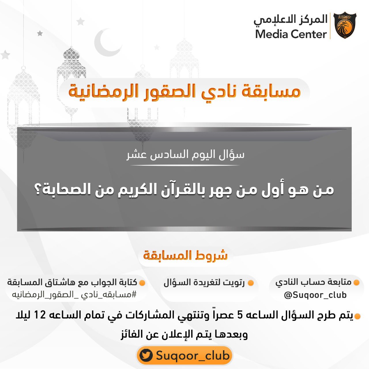 نادي الصقور الرياضي On Twitter سؤال اليوم السادس عشر ١٦ من هو أول من جهر بالقرآن الكريم من الصحابة مسابقه نادي الصقور الرمضانيه لاتنسى تطبق الشروط كاملة تتابع حساب النادي Suqoor Club